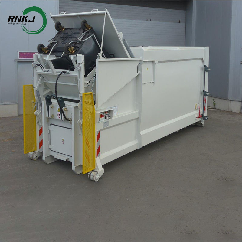 The RNKJ series of Bucket Trash Compaction Station enables customers to empty their waste bins safely and efficiently. Our systems can be customized to meet your needs. RNKJ wheelie bin tipping units can lift and empty nearly any type of wheelie bin or waste container, placing it into a compactor or roll-off bin.