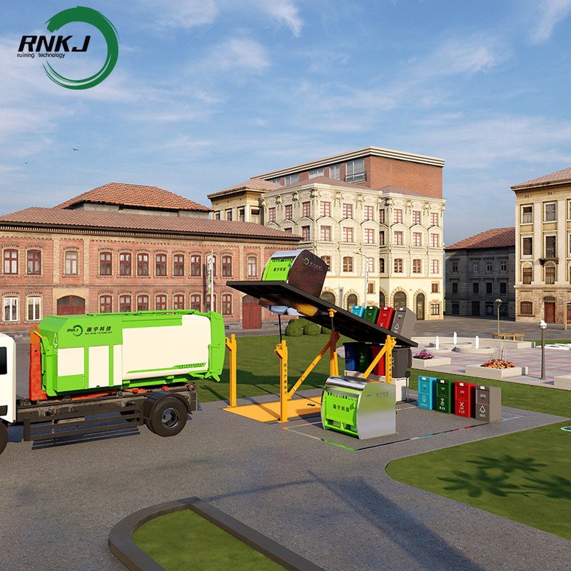 when the box body is full of garbage collection system will be prompted to start the lifting system,the equipment will be raised to the ground level,and then the compressed box body will be compressed with the compartments of the removable garbage truck to transport to the garbage disposal center; after the dumping of the garbage,the compressed box body will be transported back to the elevating platform,and then the platform as a whole fall into the ground.