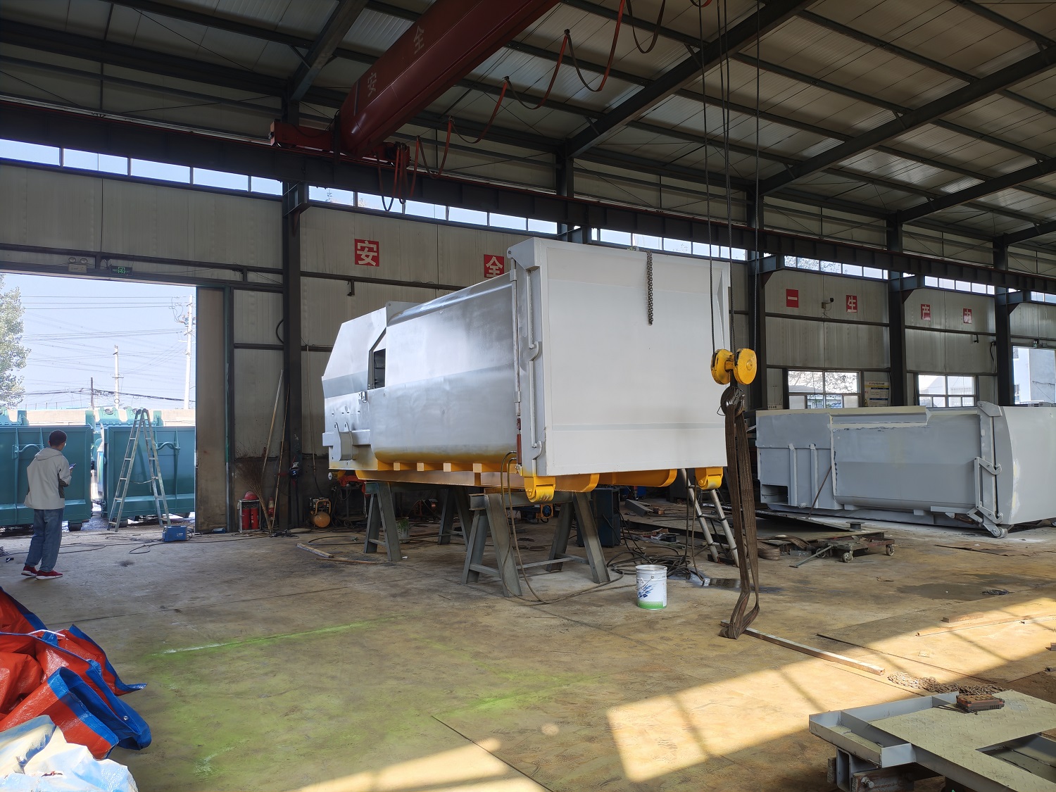 The garbage compressor mainly consists of compression chamber assembly, garbage box assembly, push head, discharge door, bucket mechanism, electronic control system and hydraulic system: